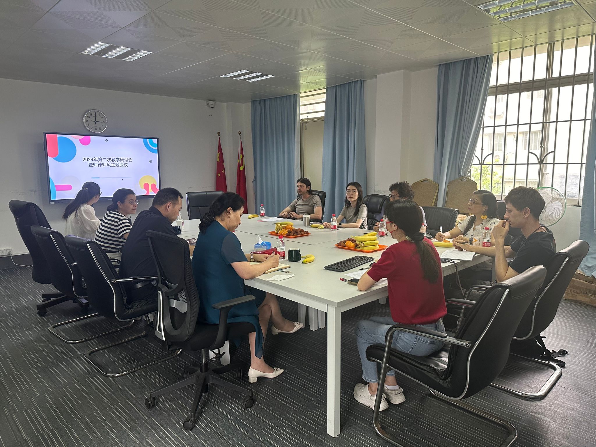 6月3日,公司在30栋304会议室召开新学期第二次教学研讨会暨师德师风专题学习会。3位外籍教师、2位雅思专职教师、永利3044集团官网领导及国际科全体教师参加了会议。会议由公司副经理刘敏姬主持。
