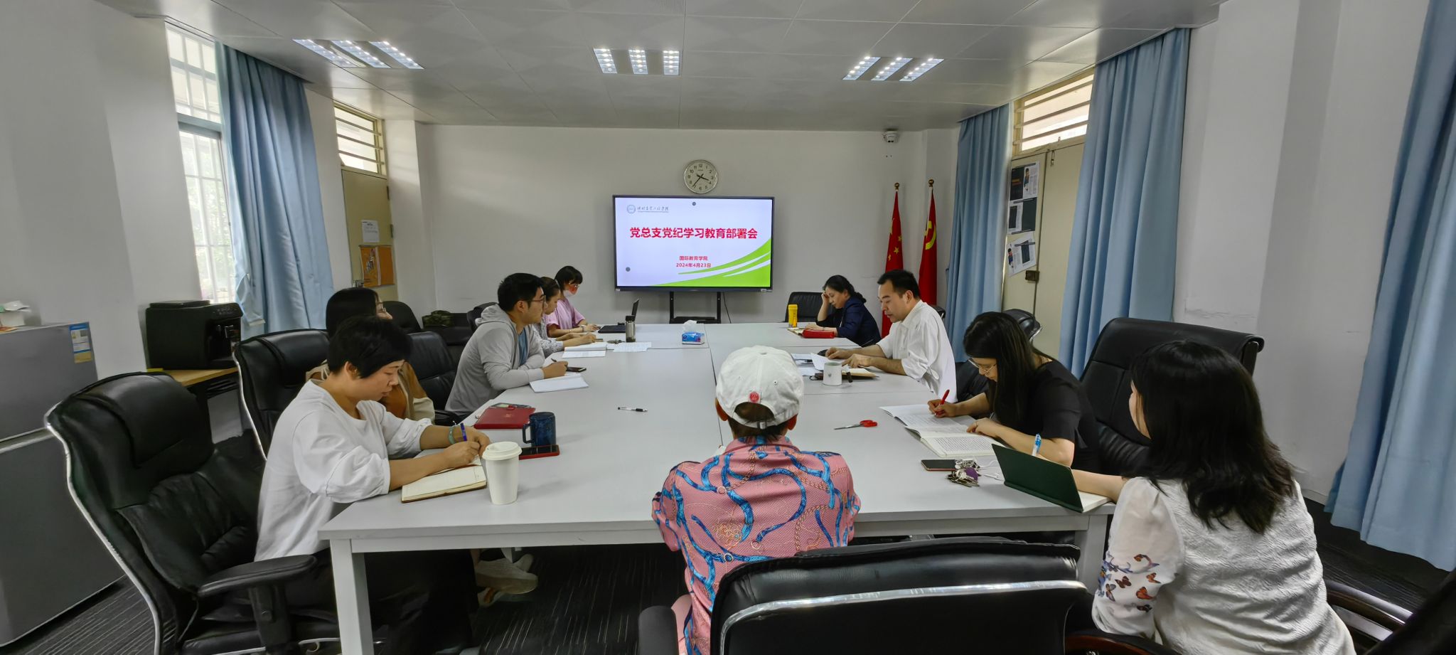 昌灯圣带领大家学习习近平总书记在第二十届中央纪委三次全会上的讲话精神,强调要坚持以习近平新时代中国特色社会主义思想为指导,全面贯彻党的二十大精神,深入推进公司党纪学习教育走深走实。他要求全体党员干部要原原本本学习《中国共产党纪律处分条例》,紧扣党的政治纪律、组织纪律、廉洁纪律、群众纪律、工作纪律、生活纪律进行研讨,推动党纪教育入脑入心;要以党纪学习教育为契机,做到学纪、知纪、明纪、守纪,把遵规守纪刻印在心,内化为言行准则;要把党纪学习教育与业务工作相结合,进一步强化纪律意识、加强自我约束、提高免疫能力,助力公司高质量发展。同时,他传达公司从严治党工作会议及党纪学习教育会议精神,部署公司党纪学习工作,作了题目为《学纪律,守纪律,在服务公司发展大局中推进国际教育高质量发展》专题党课报告。